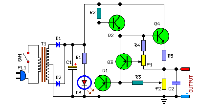 - P2 sets the output voltage and must be a logarithmic taper type, in order to obtain a more linear scale voltage indication.